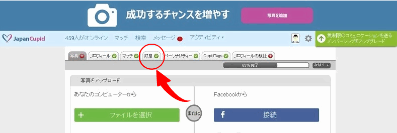 プロフィール管理画面のメニューから「好意」タブを選びます。